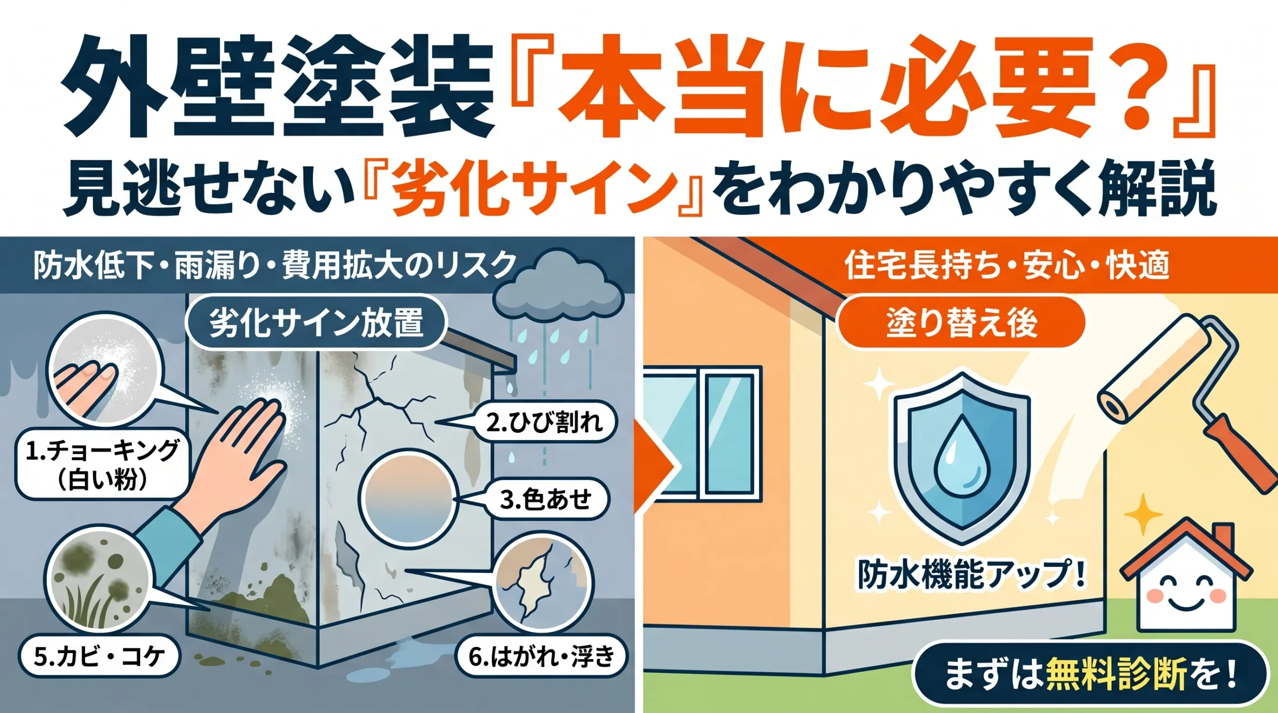 この記事では、外壁塗装がなぜ必要なのか、どのようなサインが出たら塗り替えを検討すべきなのか、そして放置するとどのような問題が生じるのかについて、詳しく解説します。